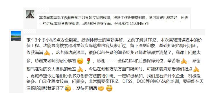 孙博士的课程视频授课条理清晰,知识点环环相扣。通过视频学习,学员们学习了现代TRIZ理论体系在研发方法理论体系中的定位,以及如何应用TRIZ工具解决问题的方法,也使培训达到了启迪思维和拓宽创新思路的目的。由于时间压缩、知识量大,第一天直到夜间21点30分才下课,但学员们依旧热情不减,在认真学习的同时还积极参与提问和交互,与助教老师进行热烈的现场讨论。